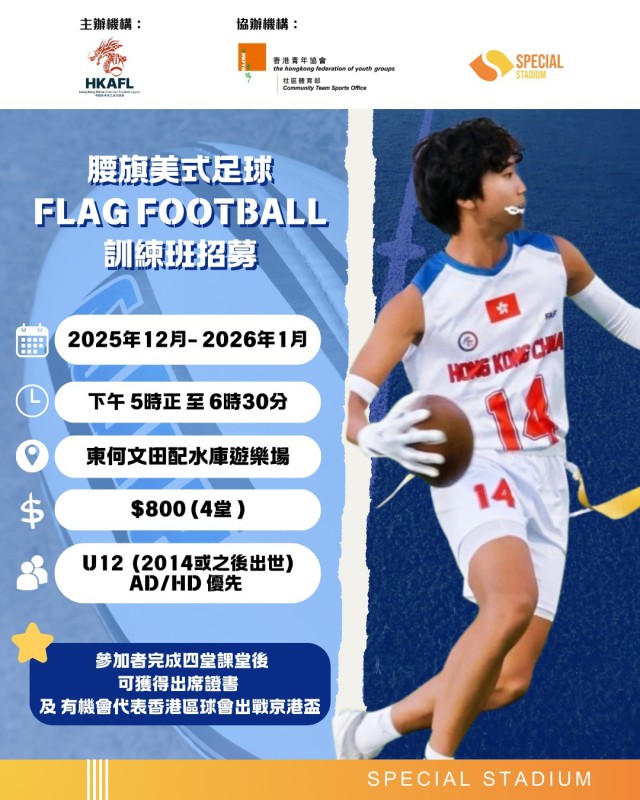 香港美式足球總會(HKAFL)同香港青年協會社區體育部合作舉辦U12腰旗美式足球訓練班,等小朋友可以接觸呢項2028洛杉磯奧運新增項目,完成訓練班仲有機會成為香港區代表球會同北京以及廣州勁旅對賽。機會難逢,快啲報名喇!