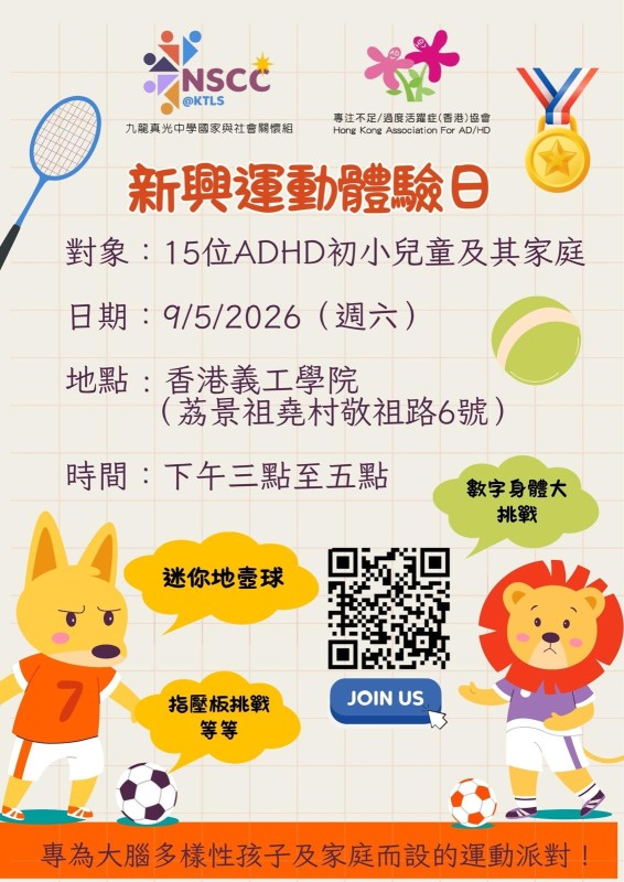 我哋為ADHD家庭特別設計咗一個充滿活力嘅週末活動! 透過新穎有趣嘅新興運動,讓小朋友喺玩樂中訓練專注,釋放能量,家長一齊參與,創造美好親子回憶!