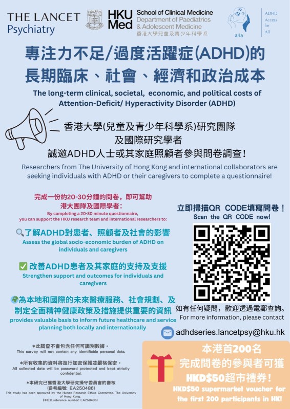 Hello! We are a research team from the Department of Paediatrics and Adolescent Medicine, The University of Hong Kong. As part of the Lancet Psychiatry Series on Attention-Deficit/Hyperactivity Disorder (ADHD), we are currently conducting a global research study to evaluate the long-term clinical, social, economic, and political implications of ADHD.