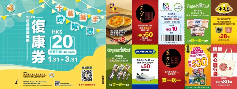 本會已參與1月31日至3月31日舉行之「復康券」慈善籌款活動2026,義賣每張港幣$20之復康券(隨券附送價值超過$20的優惠券)。